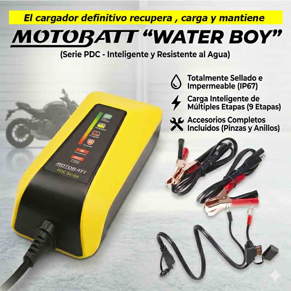 Tenemos en Chile el Cargador para baterías de motos mac completo y completo del mercado MOTOBATT water boy es ideal para hacer las cargas y mantener la batería de tu moto siempre en buen estado
