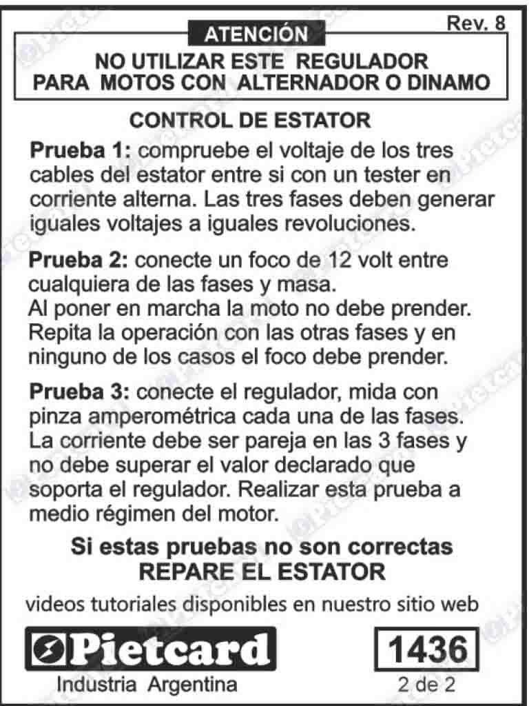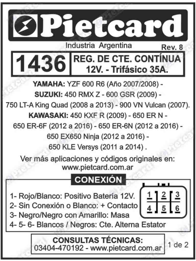Rectificador motos Kawasaki suzuki Yamaha alta cilindrada Pietcard 1436 trifasico 35 ampers